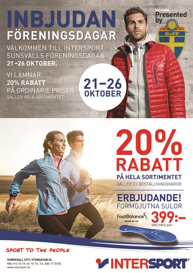 Föreningsdagar på Intersport Sundsvall 21 oktober - 26 oktober 20% på hela sortimentet (ord priser) Välkommen!