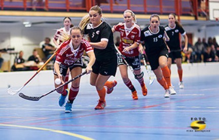 Det blev en repris från Hammarbymatchen när vi i helgen ställdes mot Storvreta på bortaplan. Segersiffrorna 5-4 efter förlängning var identiska men där slutar egentligen likheterna. Om förra matchen var en match som spelades i ett långsamt tempo, så var denna matchen helt annorlunda på den punkten. Ett tempostarkt hemmalag fick finna sig att mestadels vara det spelförande laget men sett till matchen som helhet skapade vi fler chanser av dignitet. Första perioden fick vi precis dit vi ville. Vi gjorde det trångt för Storvreta som mest fick avsluta utifrån medan vi fick bra skjuts i spelvändningar och var effektiva framåt. Ledningsmålet kom redan efter fem minuter då Frida Eriksson svarade för gott prickskjute utifrån. Efter ett mönsteranfall i den fjortonde minuten kunde sedan Sanna Stadling vackert placera in 2-0-bollen i målvaktens vänstra kryss. I mittenrundan fick hemmalaget fart på sitt spel och hotade oss på ett helt annat sätt. Med god rörlighet bakom mål och i slottet så fick vi svårare att freda målet. Det var därför inte ologiskt att Storvreta med halva matchen spelad lyckades både reducera och kvittera. Med 2-2 inför sista perioden så var matchen helt oviss. Sista perioden blev en rejäl holmgång i ett ursinnigt tempo. Ett tempo som också till stor del berodde på att domarduon hade valt en väldigt hög nivå vilket bidrog till få avblåsningar. Vi fick en bra start på perioden då Sanna Stadling satte sitt andra för kvällen men efter det tog Storvreta över och såg ut att gå mot tre poäng via två snabba mål. Återigen visar vi dock moral och lyckas kvittera med dryga två minuter kvar. Storvreta avslutar matchen med en forcering och lassar skott mot mål som vi ett på ett uppoffrande sätt täcker undan. I förlängningen får vi bra tryck mot Storvretamålet och Maja Nyman ser till att vi kan vända hemåt med ännu en tvåpoängare. Tack vare en heroisk insats lyckas vi därmed behålla vår poängsvit mot ett skickligt och fysiskt hemmalag. // Tränartrojkan